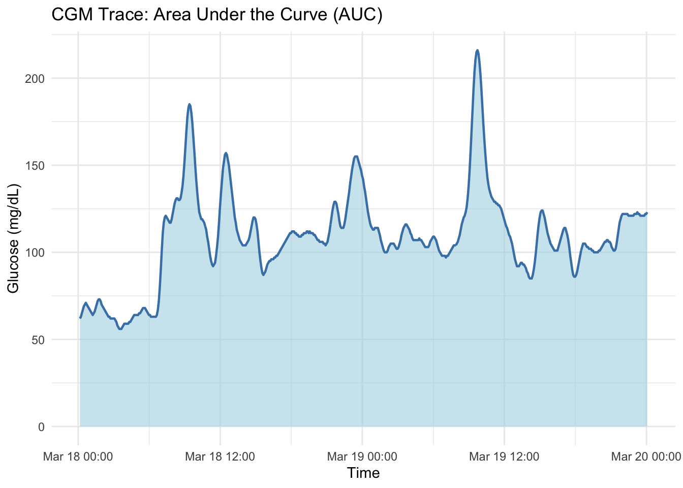 Area under the curve (AUC) in CGM analysis quantifies the total glucose exposure over time (Tai 1994). It sums the area under the glucose trace across the entire monitoring period. This reflects cumulative glucose exposure.